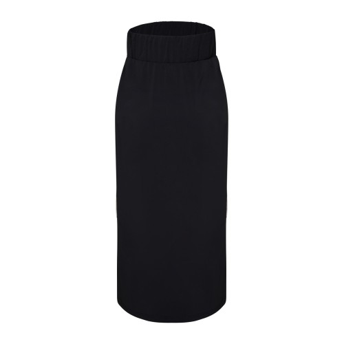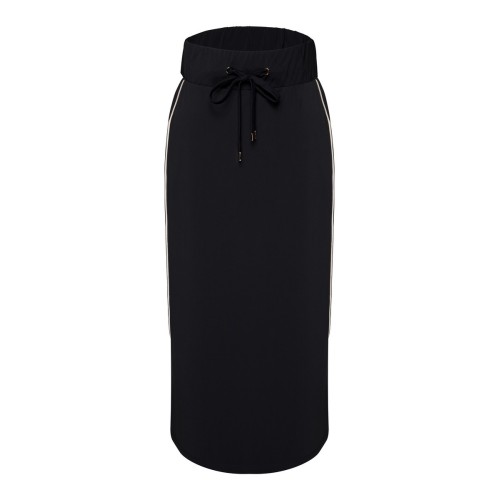 De high-waist pasvorm met brede elastische tailleband zorgt voor comfort én een flatterend silhouet. Het verfijnde koordje met gouden stoppers geeft een elegante finishing touch. De rechte midi-lengte valt mooi langs het lichaam en creëert een moderne, slanke uitstraling.