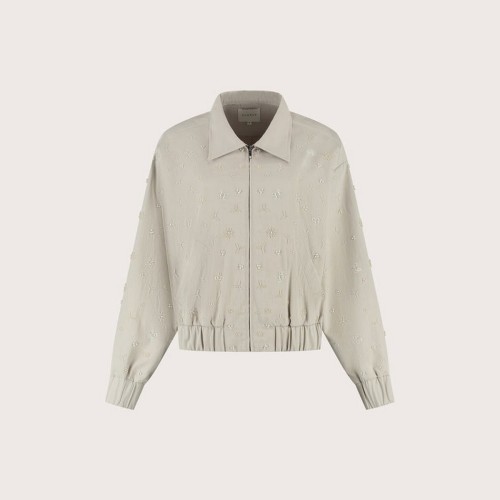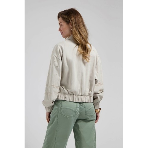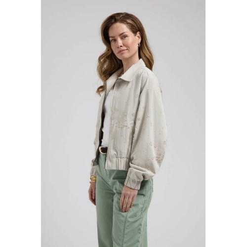 Het model heeft een elegante kraag die het jasje een rijke uitstraling geeft. De aansluitende boorden aan de mouwen en onderkant zorgen voor een mooie, moderne pasvorm. Wat dit jasje echt bijzonder maakt, zijn de bloemen van kleine kralen die subtiel over het jasje zijn verwerkt. Een speels detail dat het stoere bombermodel een vrouwelijke en stijlvolle touch geeft.