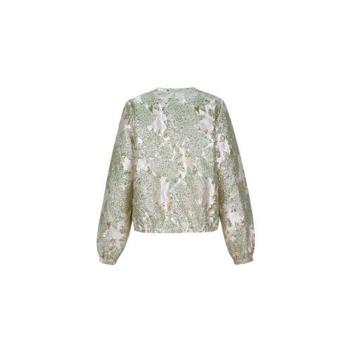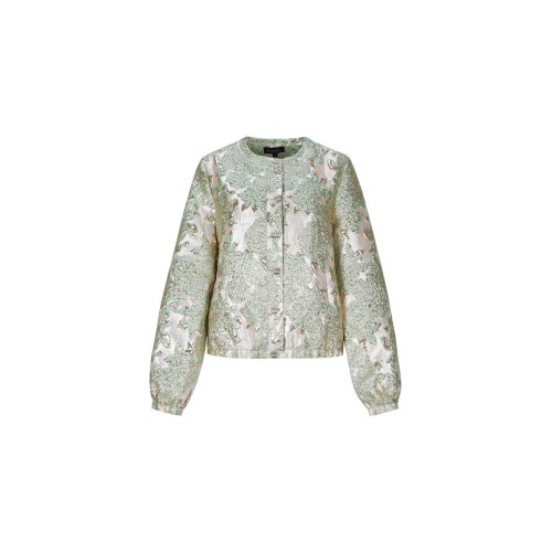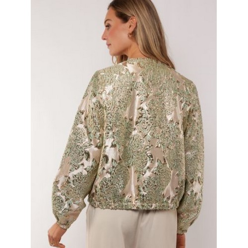 Het jacquard geweven dessin met subtiele metallic accenten zorgt voor een rijke, vrouwelijke uitstraling. De bomber-achtige snit brengt een moderne, nonchalante balans. De ronde hals en elastische boorden maken het ontwerp stijlvol én draagbaar.