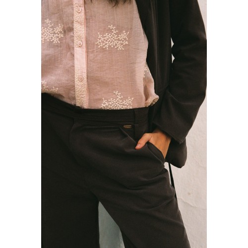 Draag de Marion blouse op een lichte pantalon of travelbroek.