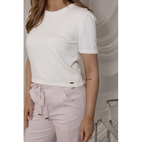 De verfijnde gehaakte boord langs hals, mouwen en zoom geeft een subtiele, vrouwelijke finishing touch.