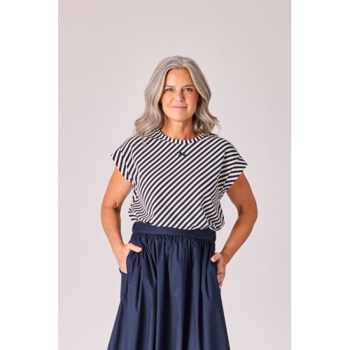 Marineblauwe streep. Een veelzijdige top die met je meebeweegt. Elke dag opnieuw.